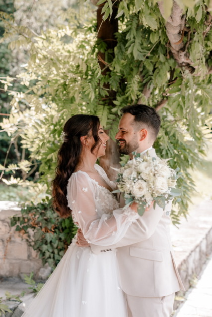 Voll im Trend und sehr elegant haben sich unser Traumpaar Chiara und Alex das JA-Wort gegeben. Sie im puristisch-extravaganten Seidentaft Kleid und er im dunkelgrünen Maßanzug aus Wolle-Mohair.